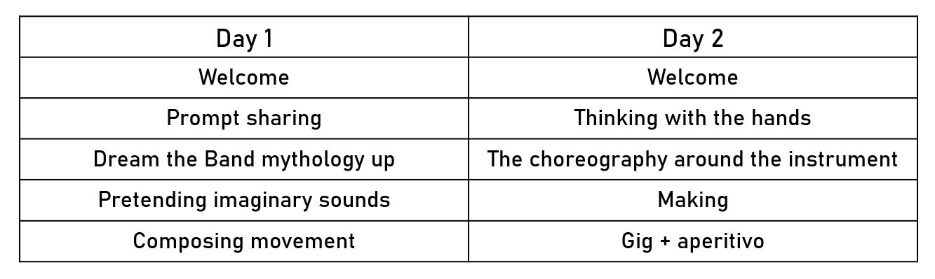 Preparation task: participants are asked to bring a prompt - an object, fabric, sound recording, drawing, word, or any other small token - that resonates with the imaginary band they dream about. It should feel like a fragment of the world their band might belong to. The prompt serves as a starting point for collective imagination, a creative anchor that helps ground the speculation and open up the world of the band.